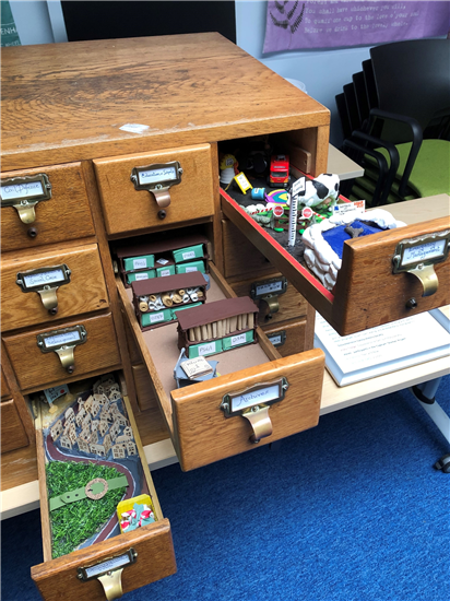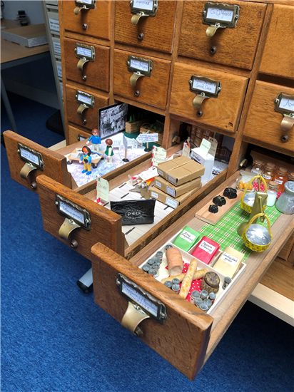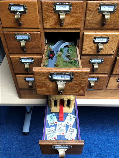 We decided to repurpose this same cabinet and place a different function of the County Council in each index drawer. Before long, drawers were heading off to the homes of various staff and Hub partners and tearoom talk was no longer about missing teaspoons, plants, or tea-towels but glue, resin and fake trees. In the end, twenty drawers, each showing a Council function were completed, involving 10 members of staff to varying degrees but all in their own time. The ‘Big Drawers – Our Cabinet of Curiosities’ was revealed at the Council themed event, ‘Our Corporate Memory’, on 6th April 2024.
